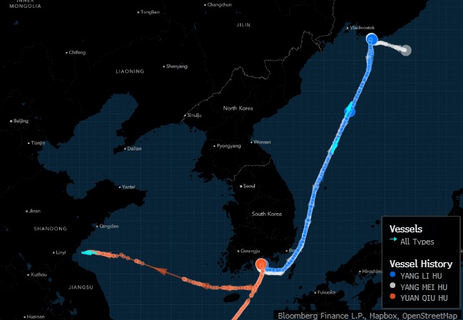 Ví dụ, hai tàu chở dầu loại nhỏ thuộc lớp Long Range-2 là Yang Li Hu và Yang Mei Hu đã nạp đầy dầu ESPO của Nga trong khoảng thời gian từ ngày 16 đến ngày 18/5. Sau đó, chúng hướng về Yeosu để chuyển dầu cho siêu tàu chở dầu Yuan Qiu Hu. Nó nạp đầy được ba phần tư dung tích sức chứa và khởi hành đến Trung Quốc. Những con tàu này thuộc sở hữu của Công ty Cosco Shipping Holdings (Trung Quốc) và được Unipec thuê để vận chuyển dầu.