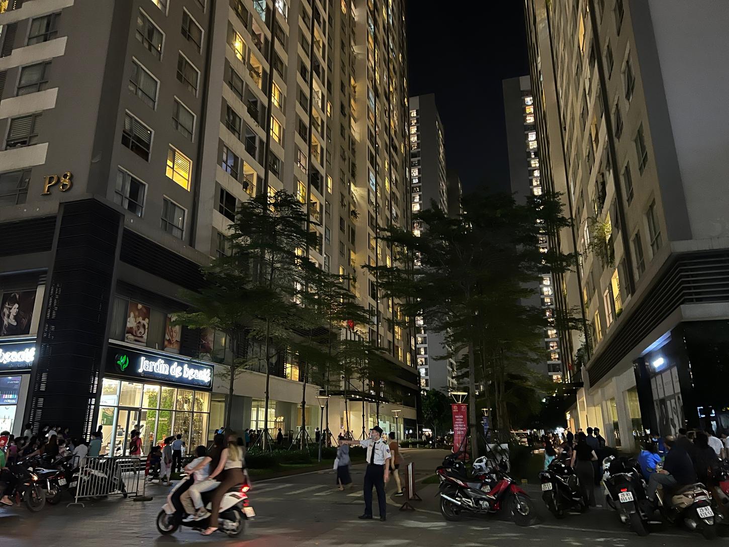Từ 18h ngày 26/5, công an và pháp y có mặt khám nghiệm hiện trường, đồng thời lấy lời khai những người liên quan. Xe cứu thương cũng được điều đến sảnh Park 1. Phía bên ngoài, người dân tập trung bàn tán xôn xao.