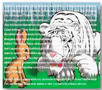 Thỏ: "Chắc chắn ấy chứ, tớ có thể chứng minh. Đi với tớ thì biết" Cả hai biến vào hang thỏ. Một lát sau chỉ có mình thỏ lộn trở ra và tiếp tục gõ máy chữ. Một lúc sau sói đi ngang qua, thấy vậy dừng lại coi chú thỏ đang làm việc gì mà cần mẫn thế. Sói: "Này cậu đang làm gì thế?" Thỏ: "Tớ đang viết luận án làm thế nào để thỏ ăn thịt được chó sói". Sói (cất tiếng tiếng cười hô hố): "Cậu hy vọng sẽ được đăng cái luận án rác rưởi đó chứ hả?". Thỏ: "Không có vấn đề gì. Cậu muốn biết tại sao không?"