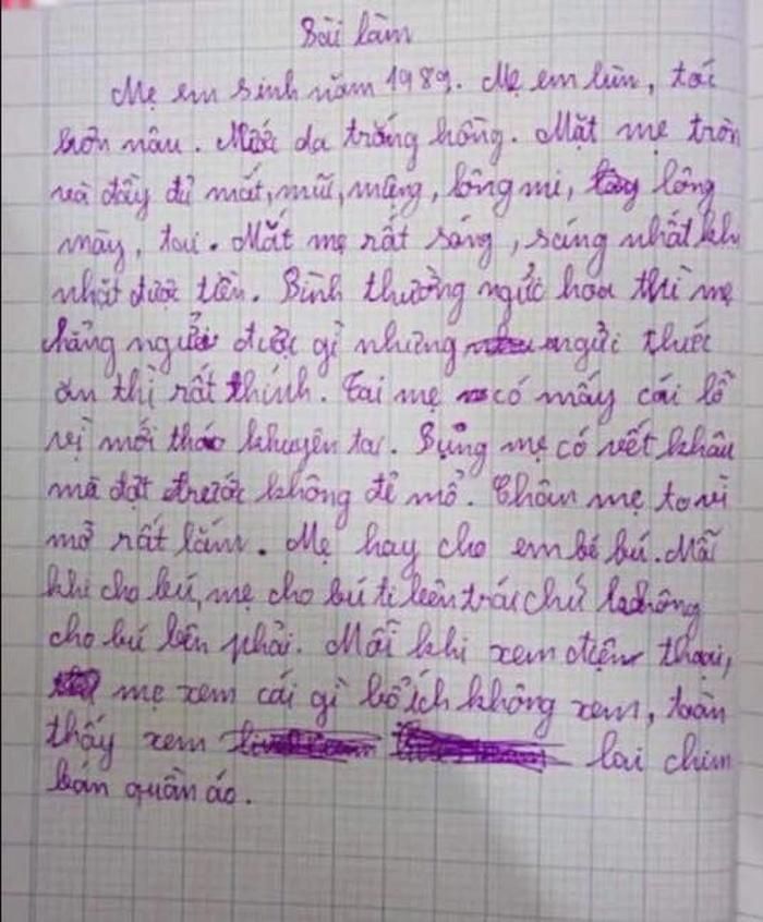 "Mẹ em sinh năm 1989. Mẹ em lùn, tóc hơi nâu. Nước da trắng hồng. Mặt mẹ tròn và đầy đủ mắt, mũi, miệng, lông mi, lông mày, tai. Mắt mẹ rất sáng, sáng nhất khi nhặt được tiền. Bình thường ngửi hoa thì mẹ chẳng ngửi được gì nhưng ngửi thức ăn thì rất thính. Tai mẹ có mấy cái lỗ vì mới tháo khuyên tai. Bụng mẹ có vết khâu mà đợt trước không đẻ mổ. Chân mẹ to vì mỡ rất lắm. Mẹ hay cho em bé bú. Mỗi khi cho bú, mẹ cho bú ti bên trái chứ không cho bú bên phải. Mỗi khi xem điện thoại mẹ xem cái gì bổ ích không xem toàn thấy xem lai chim (livestream - PV) bán quần áo."