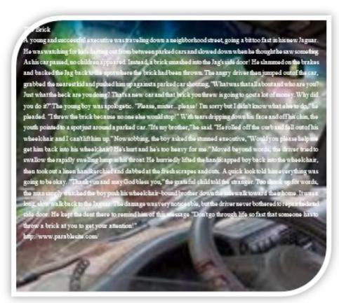 Quãng đường quay trở lại xe thật là dài. Chiếc xe bị hư hại khá nặng, nhưng anh cũng chẳng buồn đi sửa tấm kính bên hông vừa bị ném vỡ nát. Anh cứ để nguyên chỗ vỡ như thế để nhắc nhở với mình rằng: “Trong cuộc đời, đừng bao giờ đi quá nhanh để rồi có một ai đó buộc phải ném cục gạch để thức tỉnh mình!”