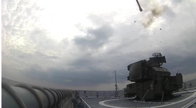 Thử nghiệm hệ thống tên lửa đất đối không Tor được gắn trên boong tàu chiến Nga (Ảnh: Defense Express).