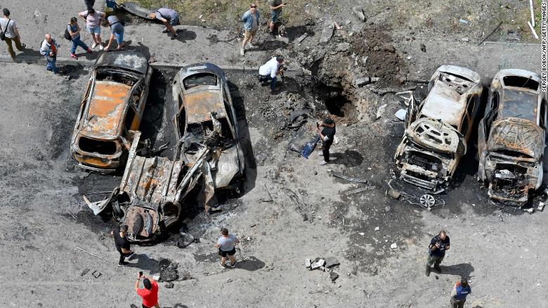 Tên lửa Nga phá hủy nhiều xe hơi đằng sau một khu dân cư ở tỉnh Kharkiv, Ukraine ngày 26.6.