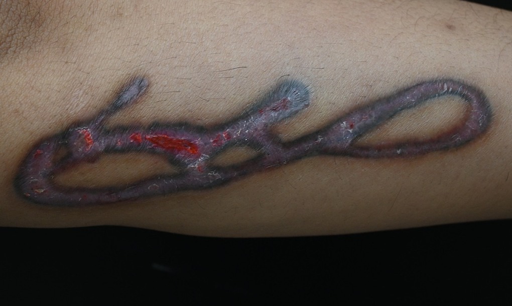 Sau khi xóa hình xăm trên cánh tay bằng laser QS, người đàn ông 32 tuổi nổi các bóng nước, bỏng mủ nhiễm trùng, đau nhức, sốt, có thể để lại sẹo xấu khó khắc phục.