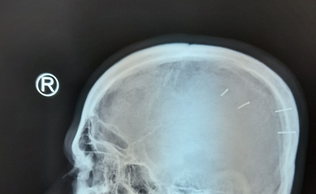 Bệnh nhân 36 tuổi, nhập viện trong tình trạng xuất huyết não, các bác sĩ chụp X-Quang phát hiện 4 cây đinh đóng vào đầu.