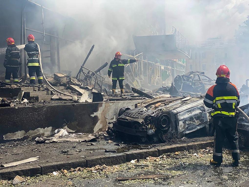 Lính cứu hoả tại hiện trường vụ tấn công tên lửa ở thành phố Vinnystia, miền trung Ukraine ngày 14/7. Ảnh: AP.