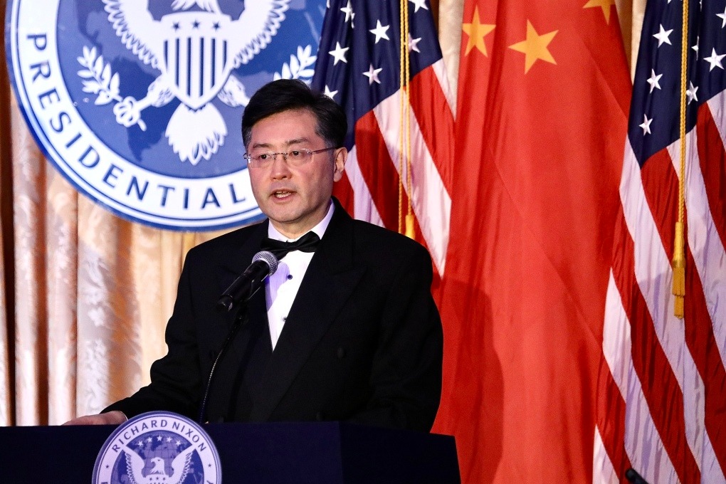 Đại sứ Trung Quốc tại Mỹ Tần Cương phát biểu tại thành phố Yorba Linda, bang California, Mỹ, ngày 24/2. Ảnh: AFP.