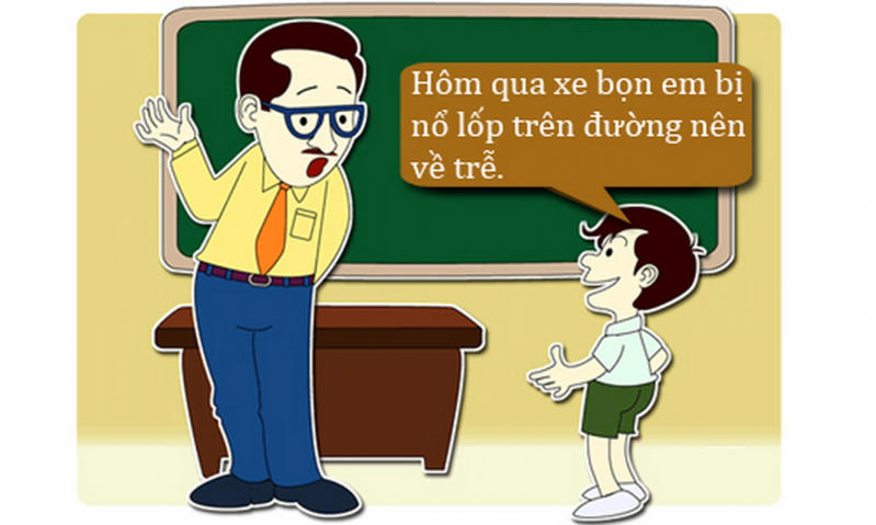 Đã vào tiết học, Tí lúc này mới bước vào cổng trường. bác bảo vệ kêu lại và hỏi: