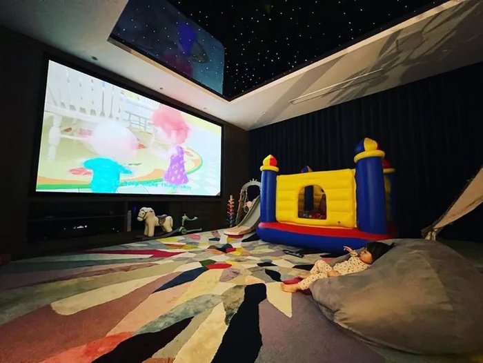 Dễ thấy, căn phòng được lắp đặt màn hình lớn và máy chiếu để ái nữ xem hoạt hình, bày biện nhiều mô hình đồ chơi khủng. Chưa kể, căn phòng còn ghi điểm bởi chi tiết trải thảm màu sắc tươi sáng an toàn, có ghế lười để nằm nghỉ ngơi.