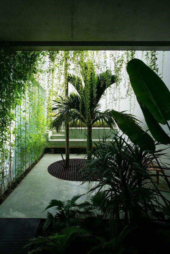 Hai cây cau tạo bố cục cho tiểu cảnh của tầng 1, bố trí bóng mát ở tầng 2 và là góc nhìn thư giãn cho phòng ngủ tầng 3.