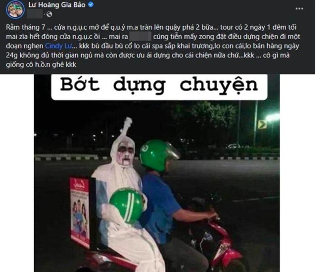 Mai ra *** cúng tiễn mấy vong đặt điều dựng chuyện đi một đoạn nghen Cindy Lư. Bù đầu bù cổ lo cái spa sắp khai trương, lo con cái, lo bán hàng ngày 24 giờ không đủ thời gian ngủ còn được ưu ái dựng cho cái chuyện nữa chứ. Cô gì mà giống cô hồn ghê”, Lư Hoàng Gia Bảo viết.