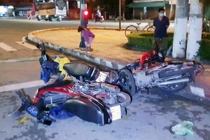 Cú tông mạnh khiến 4 xe máy nằm ngổn ngang trên đường. Ông Bình và một phụ nữ bị thương được người dân đưa đi bệnh viện cấp cứu.