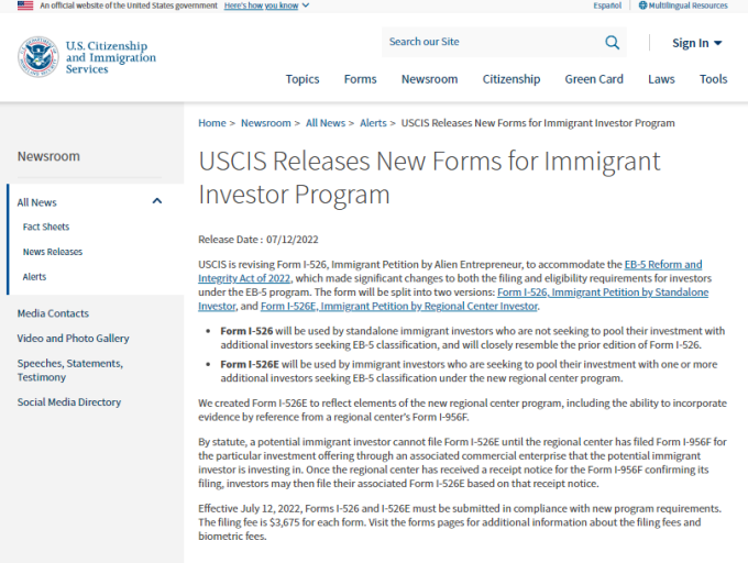 Mới đây, Sở Di trú Mỹ đã phát hành mẫu đơn I-526E dành cho các cá nhân tham gia chương trình EB-5 theo trung tâm vùng. Mẫu đơn này là phiên bản mới tách biệt với I-526 - mẫu đơn xin nhập cư của nhà đầu tư EB-5 trực tiếp. Do đó hồ sơ đầu tư định cư EB-5 qua trung tâm vùng sẽ phải sử dụng mẫu đơn mới I-526E áp dụng từ ngày 12/7. Chi phí nộp đơn là 3.675 USD.