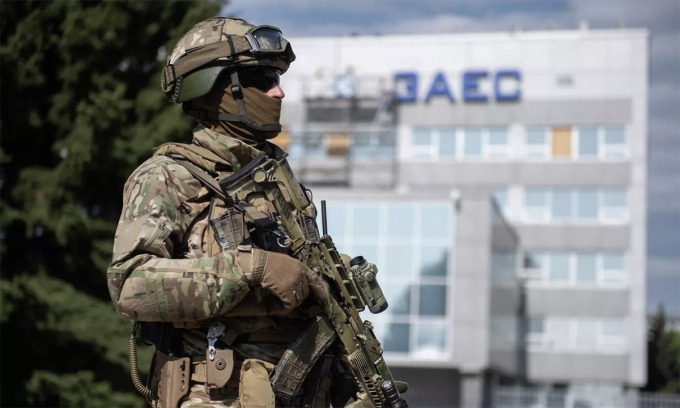 Quân nhân Nga gác trong khuôn viên nhà máy điện hạt nhân Zaporizhzhia của Ukraine đầu tháng này. Ảnh: RIA Novosti.