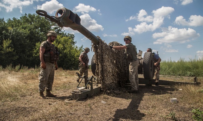 Binh sĩ Ukraine triển khai lựu pháo D-30 do Liên Xô sản xuất tại trận địa ở tỉnh Mykolaiv ngày 13/8. Ảnh: Reuters.