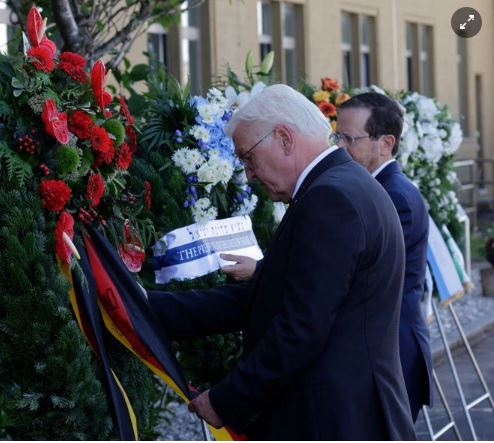 Tổng thống Đức Frank-Walter Steinmeier và người đồng cấp Israel Isaac Herzog đặt hoa tưởng niệm các nạn nhân. Ảnh: Reuters.
