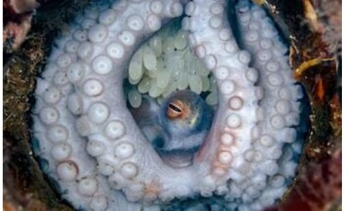 Hình ảnh con bạch tuộc đang ôm trứng mà ông Kovacs ghi lại được trong chuyến lặn biển. Ảnh: Steven Kovacs.