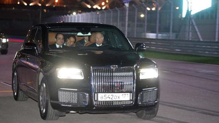 Tổng thống Nga Vladimir Putin lái chiếc xe Aurus đưa người đồng cấp Ai Cập Abdel Fatah el-Sisi thăm đường đua F1 ở Sochi năm 2018. Ảnh: Sputnik