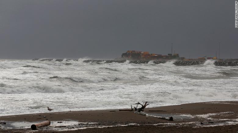 Sóng từ biển Bering dội vào một cầu cảng ở Nome, Alaska. Ảnh: CNN