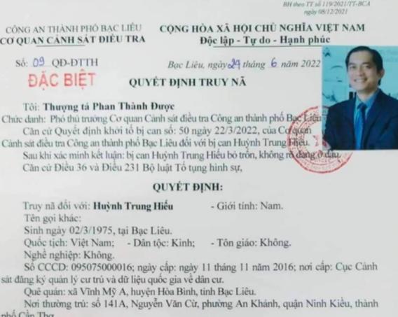 Từ đó, Cơ quan Cảnh sát điều tra Công an TP Bạc Liêu ra quyết định khởi tố bị can đối với Huỳnh Trung Hiếu. Do bỏ trốn nên Hiếu bị truy nã đặc biệt. Sau đó, Hiếu ra đầu thú vào ngày 18/6/2022.