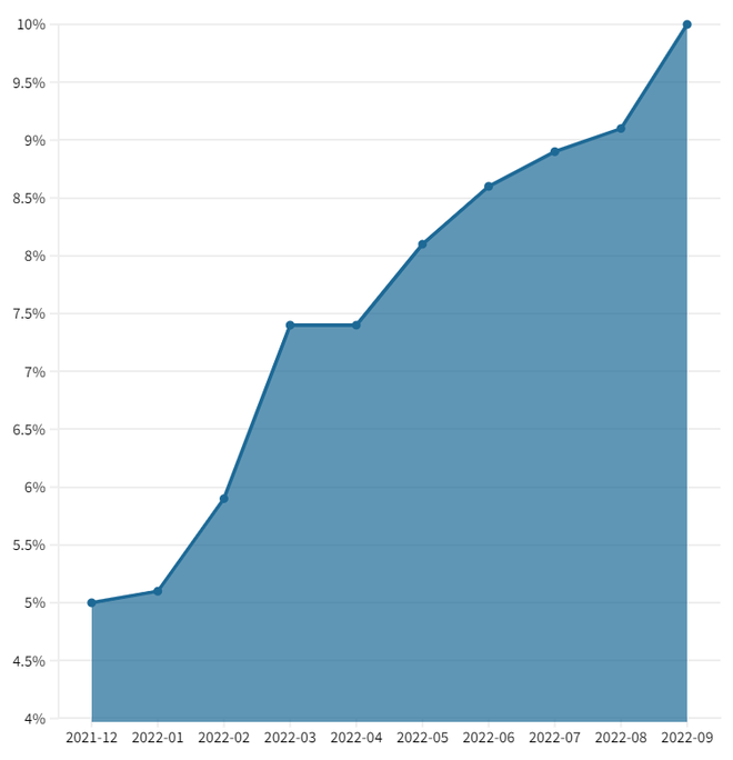 CNBC đưa tin theo dữ liệu được Cơ quan Thống kê châu Âu (Eurostat) công bố hôm 30/9, lạm phát của khu vực đồng tiền chung euro đã lập đỉnh mới 10% trong tháng 9, tăng từ mức 9,1% hồi tháng 8 và vượt dự báo 9,7%.