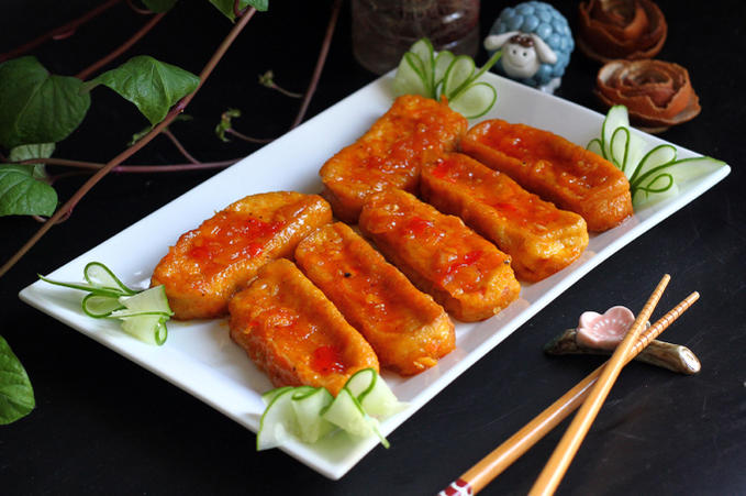 Tàu hũ cắt miếng dài, cho vào chiên vàng đều các mặt, vớt ra cho vào giấy thấm dầu.