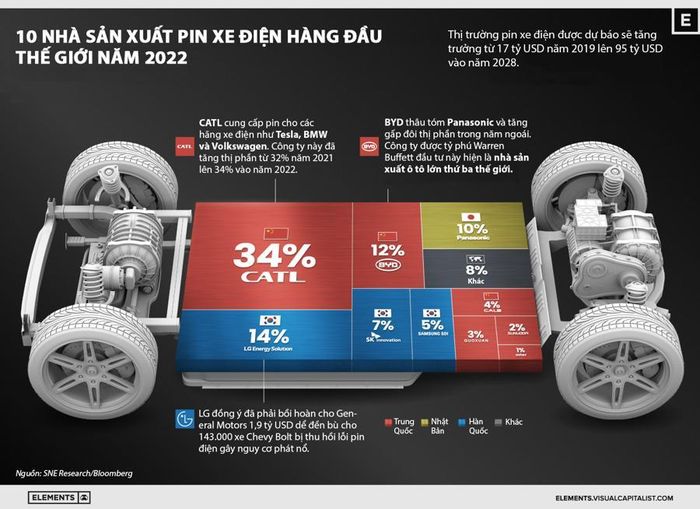 Dẫn đầu thế giới là công ty CATL của Trung Quốc với thị phần tăng từ 32% năm 2021 lên 34% năm 2022. Công ty hiện cung cấp pin xe điện cho nhiều hãng xe lớn như Tesla, Peugeot, Hyundai, Honda, BMW, Toyota, Volkswagen và Volvo.