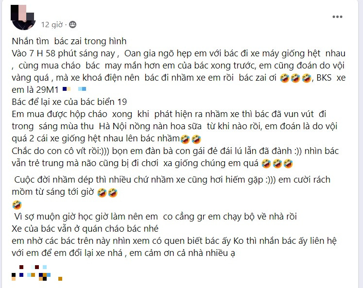 Cuộc đời nhầm dép thì nhiều chứ nhầm xe cũng hơi hiếm gặp. Em cười rách mồm từ sáng tới giờ. Vì sợ muộn giờ học giờ làm nên em co cẳng chạy bộ về nhà rồi. Xe của bác vẫn ở quán cháo bác nhé. Em nhờ các bác trên này nhìn xem có quen biết bác ấy không thì nhắn bác ấy liên hệ với em để em đổi lại xe nhá. Em cảm ơn cả nhà nhiều ạ".