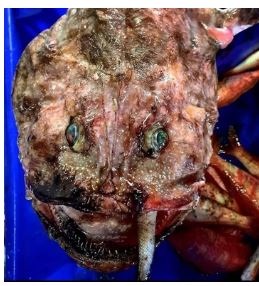 Người này cho biết con cá được đánh bắt ở độ sâu 140 m. Trong ảnh, con cá có miệng màu đen với một hàng răng, da nhầy nhụa và có vẻ là bị bắt khi đang dùng bữa vì có một con cá bạc mắc ở trên miệng.