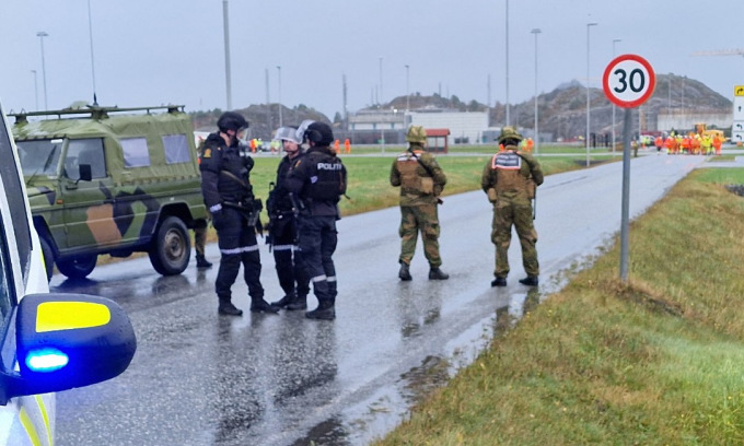 Lực lượng an ninh bên ngoài một mỏ khí đốt ở Aukra, Na Uy, hôm 13/10. Ảnh: Reuters.