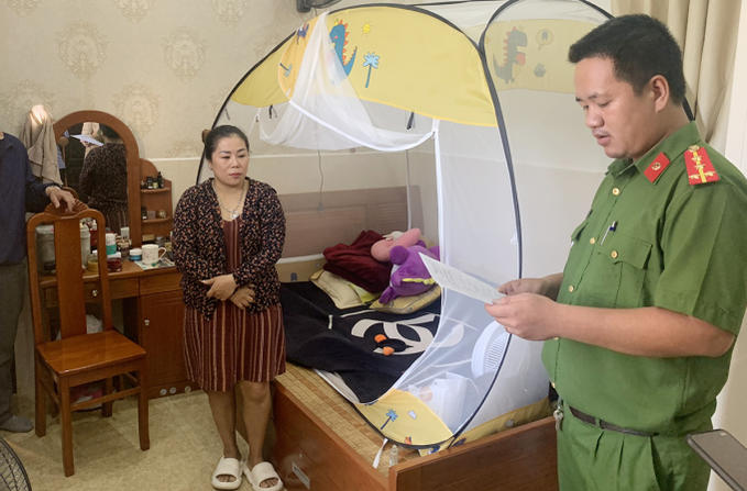 Cảnh sát đọc lệnh người trong trường hợp khẩn cấp, lệnh khám xét với bà Sương. Ảnh: Đắc Thành