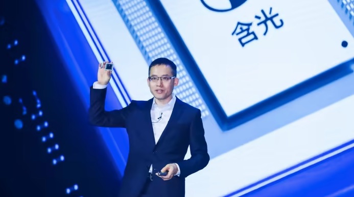 Jeff Zhang, Giám đốc công nghệ Alibaba, giới thiệu chip Hanguang 800 cho AI và máy học vào tháng 9/2019 ở Hàng Châu. Ảnh: Alibaba