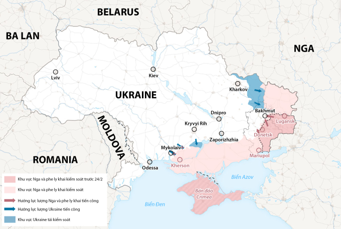 Thành phố Bakhmut và cục diện chiến trường Ukraine sau hơn 8 tháng giao tranh. Đồ họa: WP.