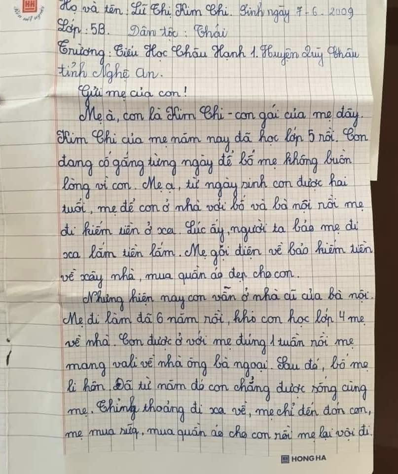 Mẹ à, con là Kim Chi – con gái của mẹ đây. Kim Chi của mẹ đã học lớp 5 rồi. Con đang cố gắng từng ngày để bố mẹ không buồn lòng vì con. Mẹ à, từ ngày sinh con được 2 tuổi, mẹ để con ở nhà với bố và bà nội rồi mẹ đi kiếm tiền ở xa. Lúc ấy, người ta bảo mẹ đi xa lắm tiền lắm. Mẹ gọi điện về bảo kiếm tiền về xây nhà, mua quần áo đẹp cho con.