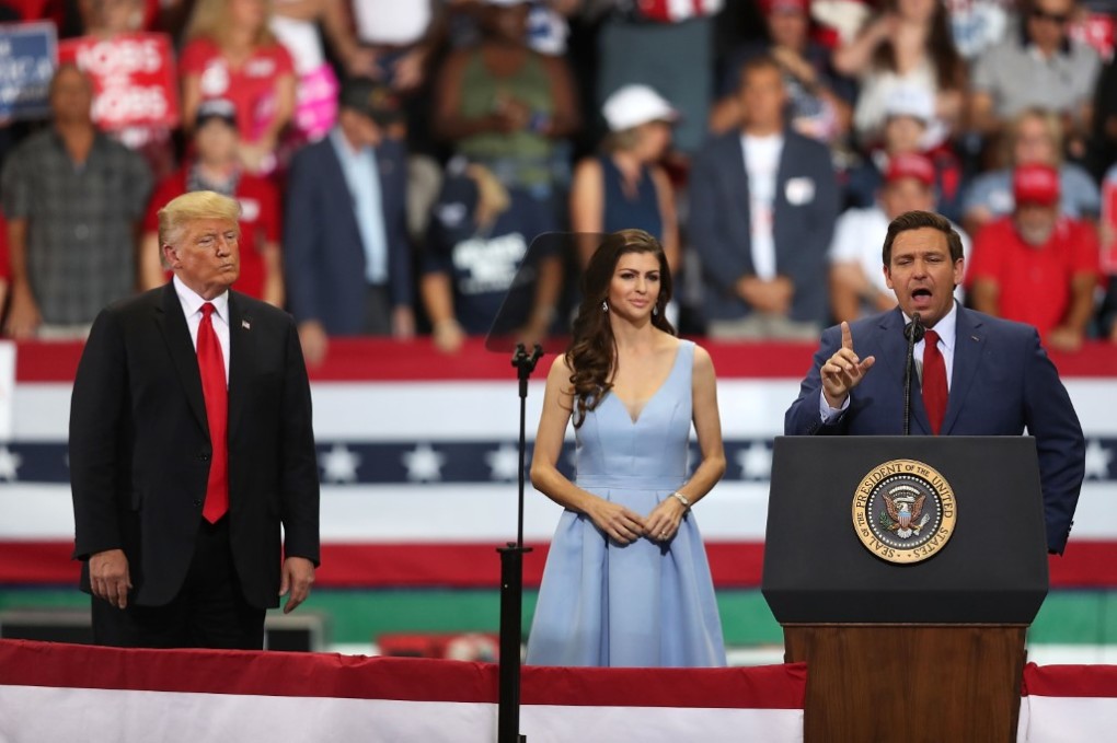 Ông Donald Trump thời còn làm tổng thống (trái) và Casey DeSantis (giữa) nghe Ron DeSantis, khi đó là ứng viên đảng Cộng hòa cho ghế thống đốc Florida, phát biểu tranh cử tại Estero, ngày 31/10/2018. Ảnh: AFP.