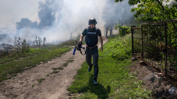 Một phóng viên chiến trường di tản khỏi một khu vực pháo kích tại thành phố Bakhmut, Ukraine, ngày 31/7. Ảnh: AFP.