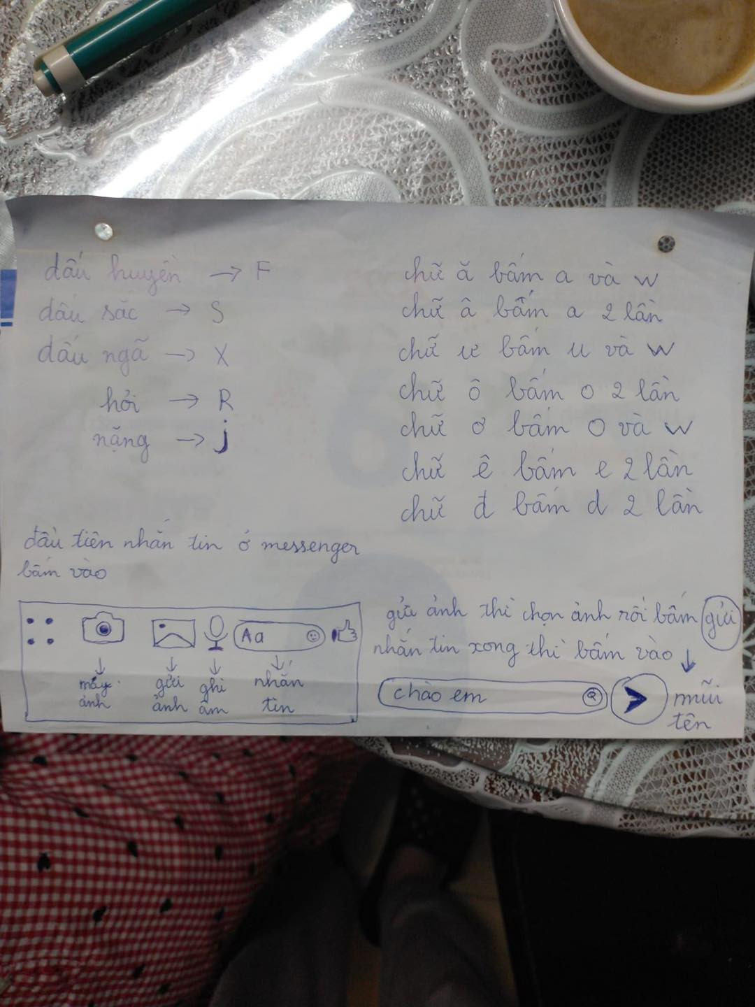 Đính kèm cùng bài viết này là hình ảnh mẩu giấy ghi lại đầy đủ các thao tác nhắn tin trên điện thoại thông minh. Từ cách gõ các loại dấu như dấu huyền, dấu sắc… hay cách viết chữ đặc biệt như ă, â, ô, đ… đều được các cháu liệt kê đầy đủ và dễ hiểu.