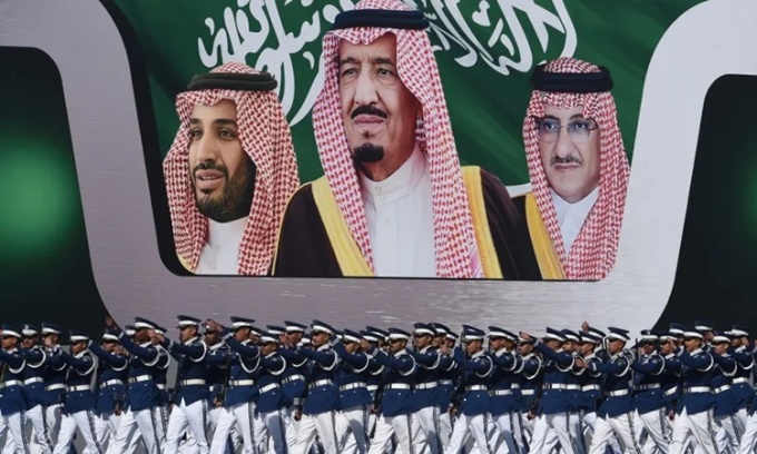 Binh lính diễu hành ngang qua tấm áp phích của Thái tử Mohammed bin Salman (ngoài cùng bên trái), Vua Salman (giữa) và Mohammed bin Nayef tại thủ đô Riyadh, Arab Saudi, hồi năm 2017. Ảnh: AFP.