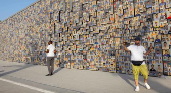 Bức ảnh của các lao động nhập cư trước sân vận động Lusail, Qatar, được chụp trước thềm World Cup. Sau khi World Cup khởi tranh, chúng đã bị gỡ bỏ. Ảnh: New York Times.