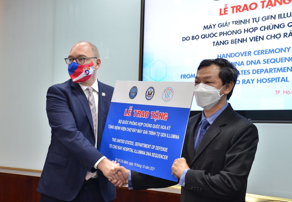 Quyền tổng lãnh sự Mỹ Robert Greenan trao tượng trưng máy giải trình tự gene cho giám đốc bệnh viện Chợ Rẫy hôm 19/10. Ảnh: American Center Ho Chi Minh City/Flickr.
