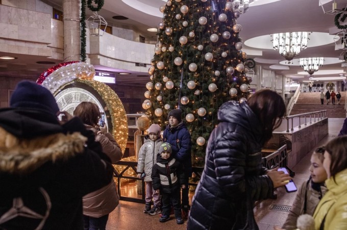 Người dân thành phố Kharkov đến chụp ảnh cùng cây thông Giáng sinh ở một nhà ga tàu điện ngầm vào ngày 11/12. Ảnh: NPR.