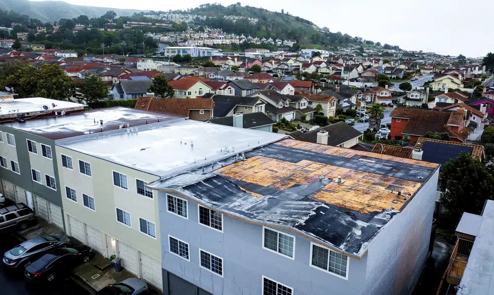 Một tòa chung cư ở San Francisco tốc mái được chụp vào hôm 10/1. Theo giới chức thành phố, gió giật với tốc độ khoảng 112 km/h trong tối 9/1 đã thổi bay nhiều phần lợp mái, trong khi mưa lớn khiến nước tràn vào nhà một số căn hộ.