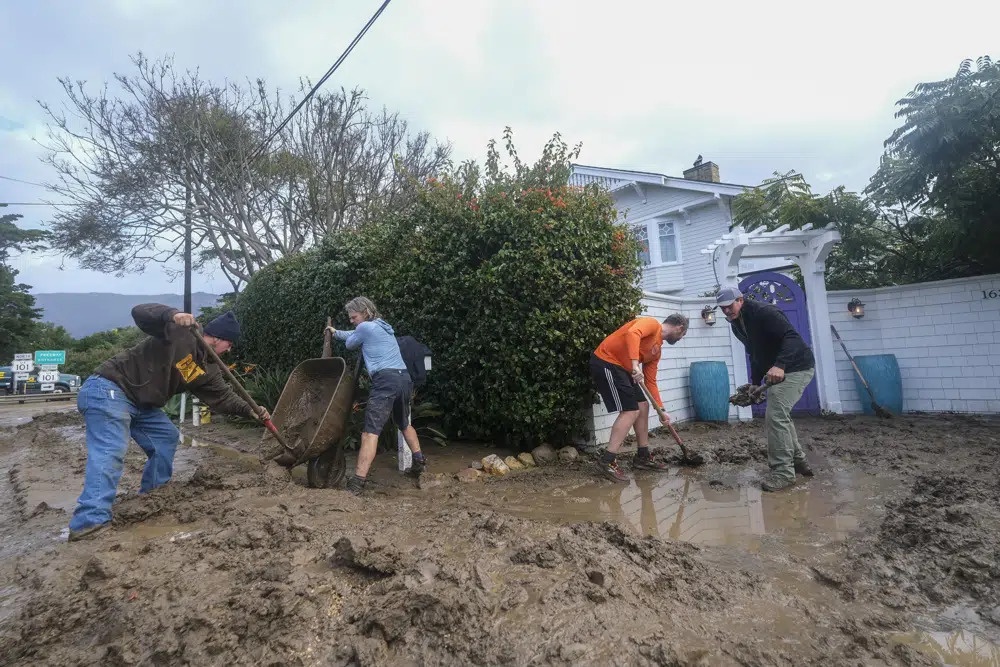 Người dân ở Montecito đang xúc bùn ở trước nhà trong ngày 10/1. Sau khi bão quét qua, người dân và giới chức khắp California đang sớm khắc phục phần nào hậu quả, đồng thời gia cố nhà cửa đê điều, trước khi những cơn bão sắp tới đổ bộ.