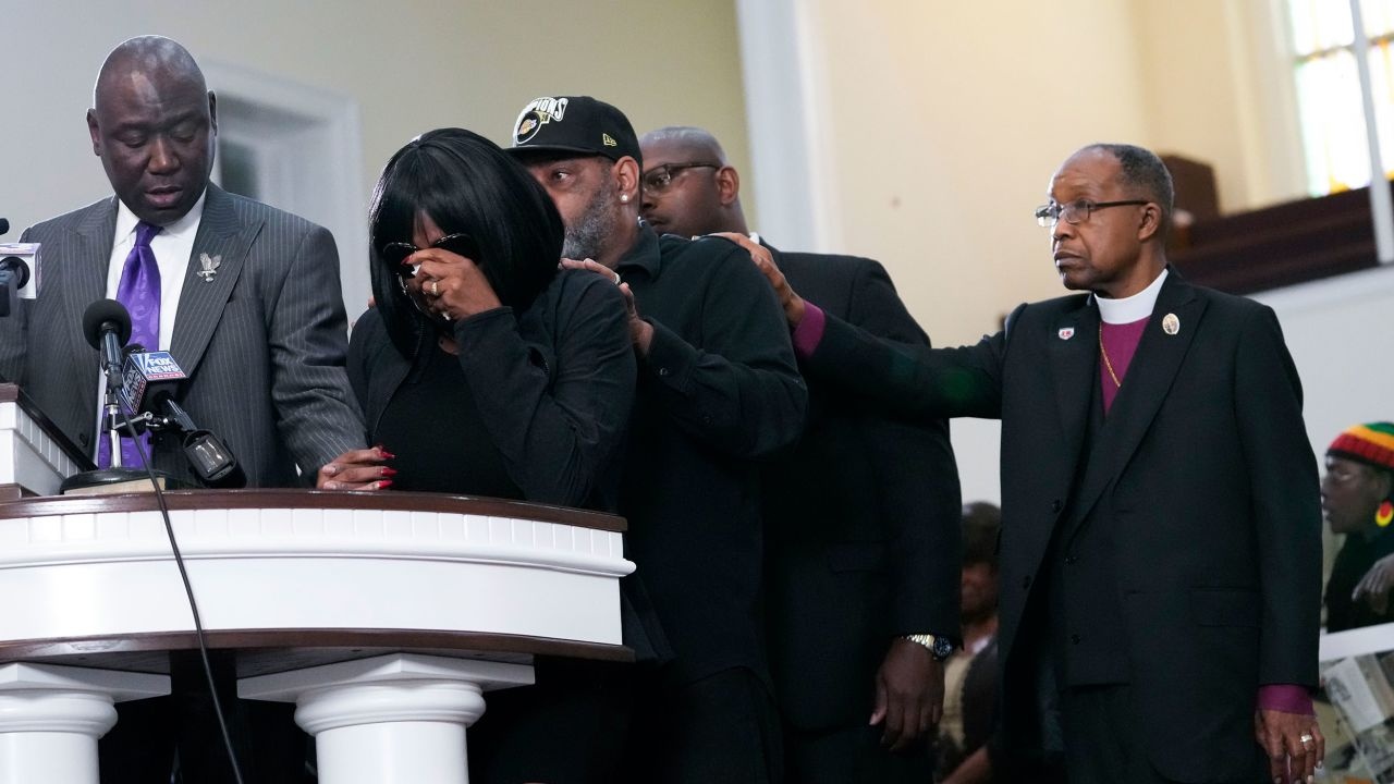 Bà RowVaughn Wells, mẹ của nạn nhân, nghẹn ngào trong cuộc họp báo ngày 26/1. Ảnh: AP.
