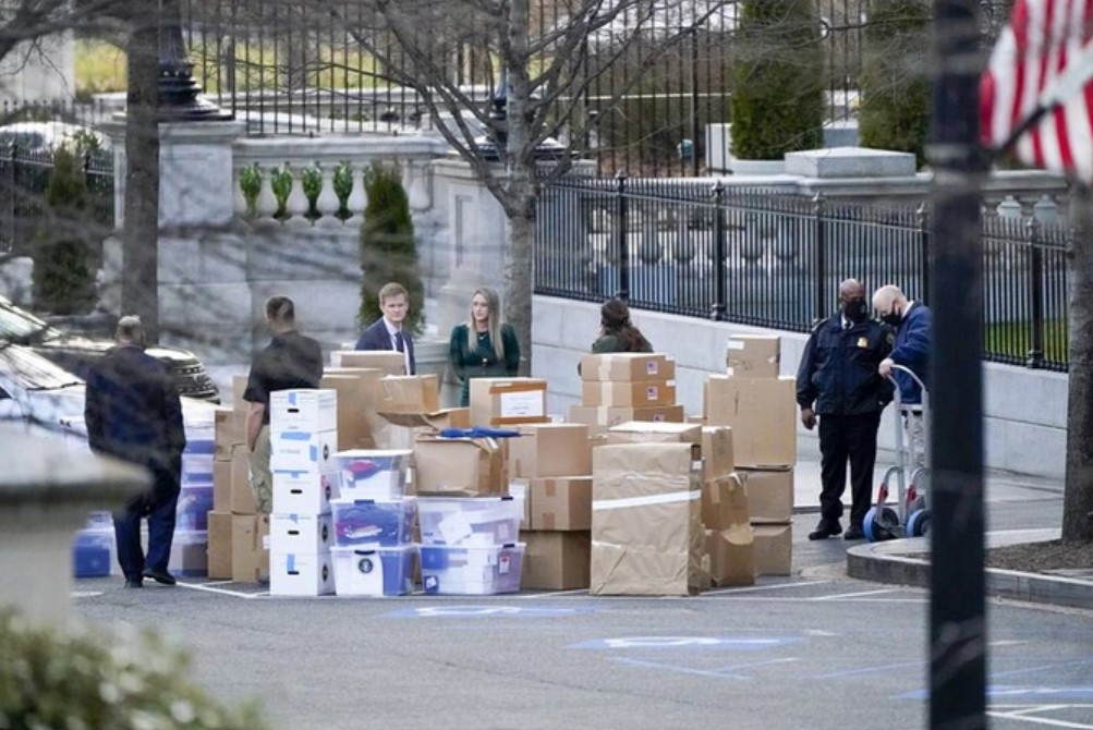 Nhiều thùng tải liệu được chuyển khỏi Nhà Trắng sau khi cựu Tổng thống Donald Trump kết thúc nhiệm kỳ (Ảnh: AP).