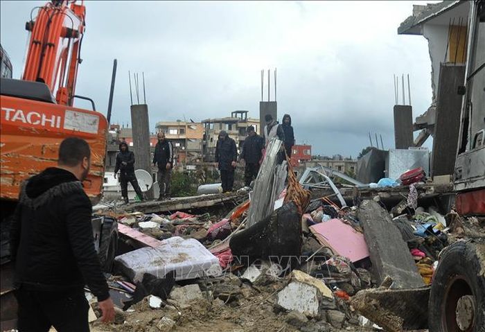 Lực lượng cứu hộ tìm kiếm nạn nhân tại hiện trường đổ nát sau trận động đất ở Jableh, tỉnh Latakia, Syria, ngày 6/2/2023. Ảnh: THX/TTXVN