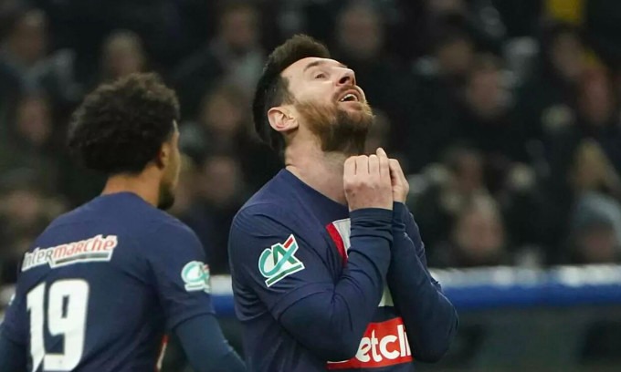 Messi tiếc nuối khi bỏ lỡ cơ hội trong trận PSG thua Marseille trên sân Velodrome, tại vòng 1/8 Cup Pháp tối 8/2/2023. Ảnh: PA