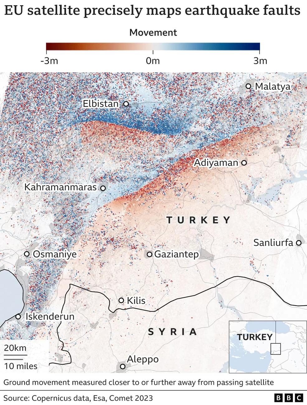 Dữ liệu thu thập từ vệ tinh Sentinel-1A của Liên minh châu Âu (EU) vào đầu ngày 10/2 mô tả cách mặt đất rung chuyển, phản ứng với những luồng năng lượng khổng lồ được giải phóng. Dữ liệu thu được khi Sentinel-1A di chuyển từ bắc xuống nam qua Thổ Nhĩ Kỳ ở độ cao 700 km.