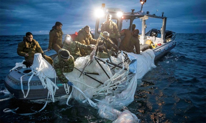 Hải quân Mỹ trục vớt xác khí cầu Trung Quốc trên vùng biển ngoài khơi bang Nam Carolina ngày 5/2. Ảnh: Reuters.