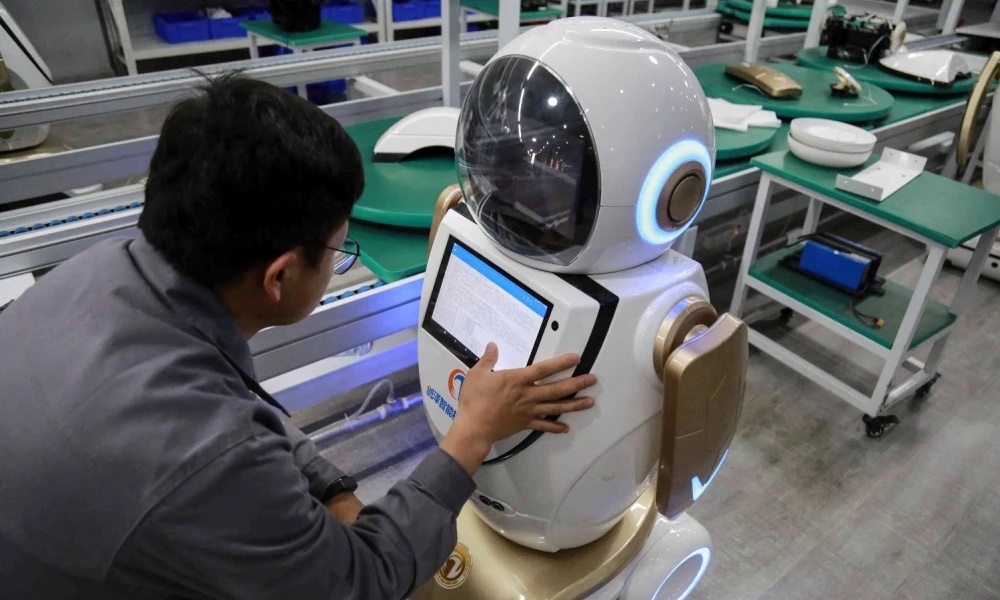 Kỹ thuật viên kiểm tra sản phẩm tại nhà máy robot Chuanze ở thành phố Trương Dịch, tỉnh Cam Túc, Trung Quốc, hồi tháng 4/2021. Ảnh: AFP.